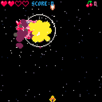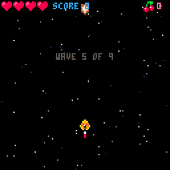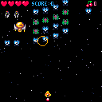 As the alien enemies fly onto the screen, fire at them, but take caution—they may shoot at you or maybe come flying down! Your objective is to defeat each opponent in each of the game's nine waves and face the boss in the end. When you kill enemies, cherries will drop at random. You can pick them up to shoot bombs or save up to 10 of them to regain a heart. A game over screen displaying your high score will appear if you lose all four of your lives.